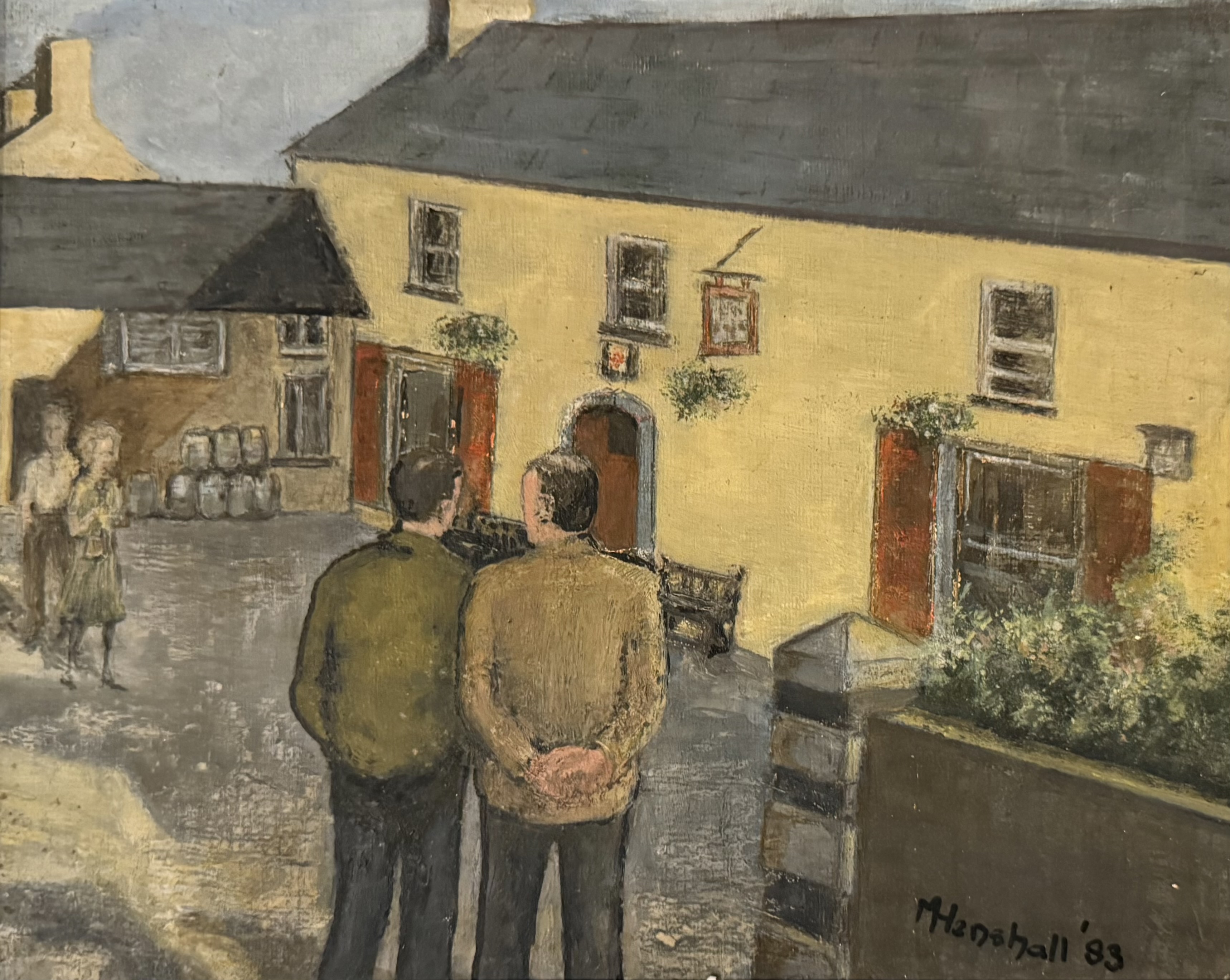 This painting is by Marjory Henshall who lived in Crofthead for around 40 years. She painted it in 1983, and titled it Jim & Ben The Pint Pot Men. In the painting, you can see Jim Regan, a previous villager who lived in Croft John, and Ben Clark, the local road man who lived in No. 1 Cwm Cottages.